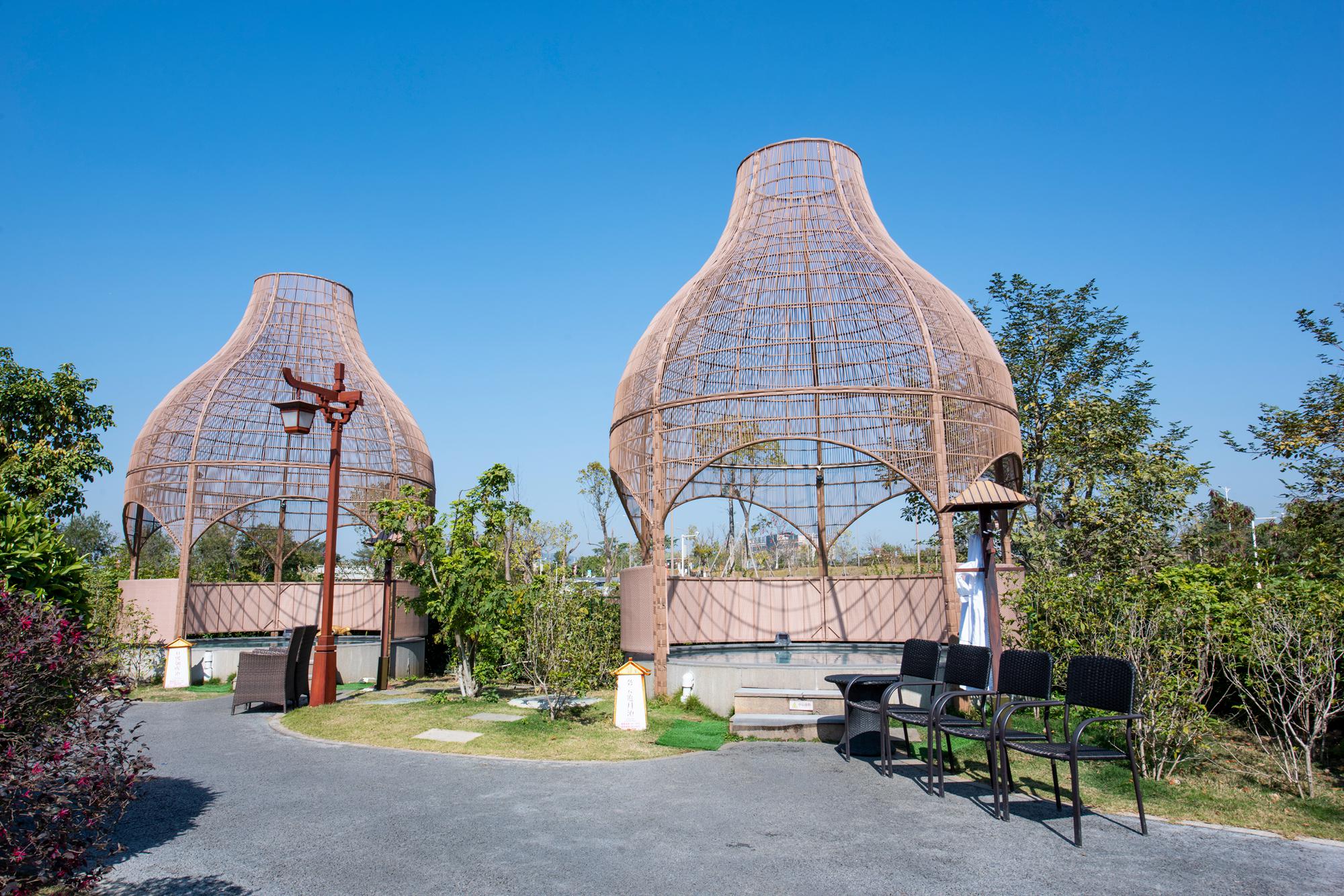 温泉区有50多个造型各异的温泉池,全部隐于草木之间。 莲花温泉坐拥温泉区C位,形似一朵盛开的莲花,不仅充满禅味,更是小镇的颜值担当,日景清新梦幻,夜景堪比大唐“华清池”。